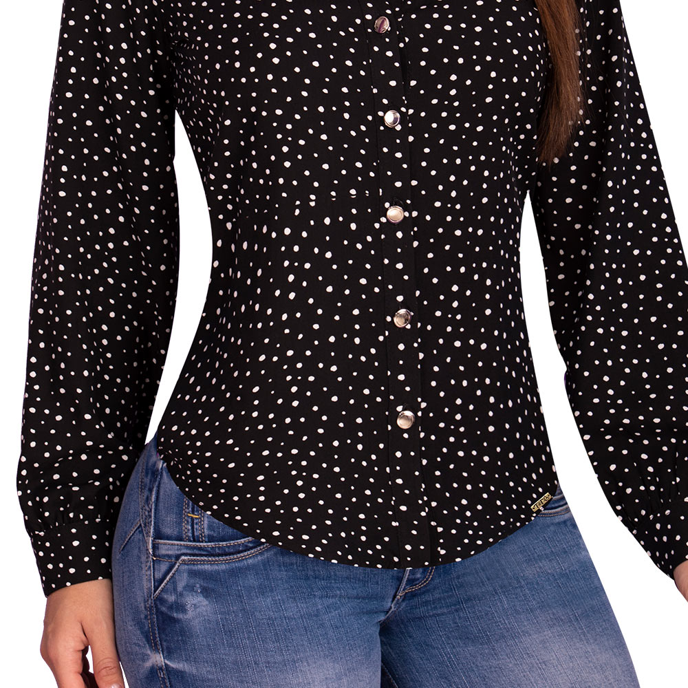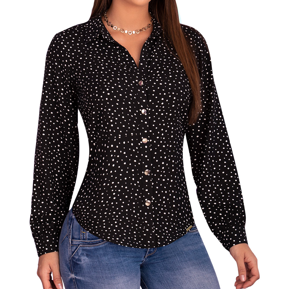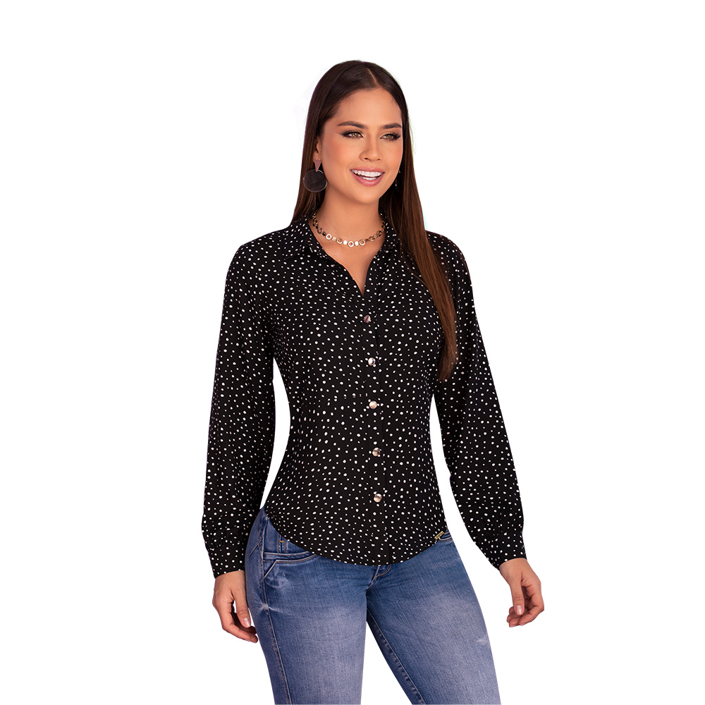 La blusa Lemur de TYT Jeans es una prenda elegante y cómoda que no puede faltar en tu guardarropa. Confeccionada en Colombia con tela de rayón estampado en color negro, esta blusa de manga larga y cuello en V tiene una silueta amplia que se adapta a cualquier tipo de cuerpo.