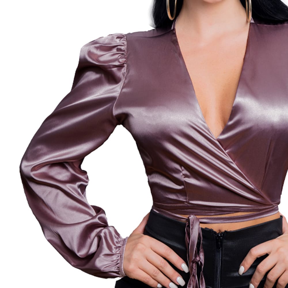 Blusa manga larga disño princesa para dama elaborada en satin en color rosa. Silueta confort, cuello en V.