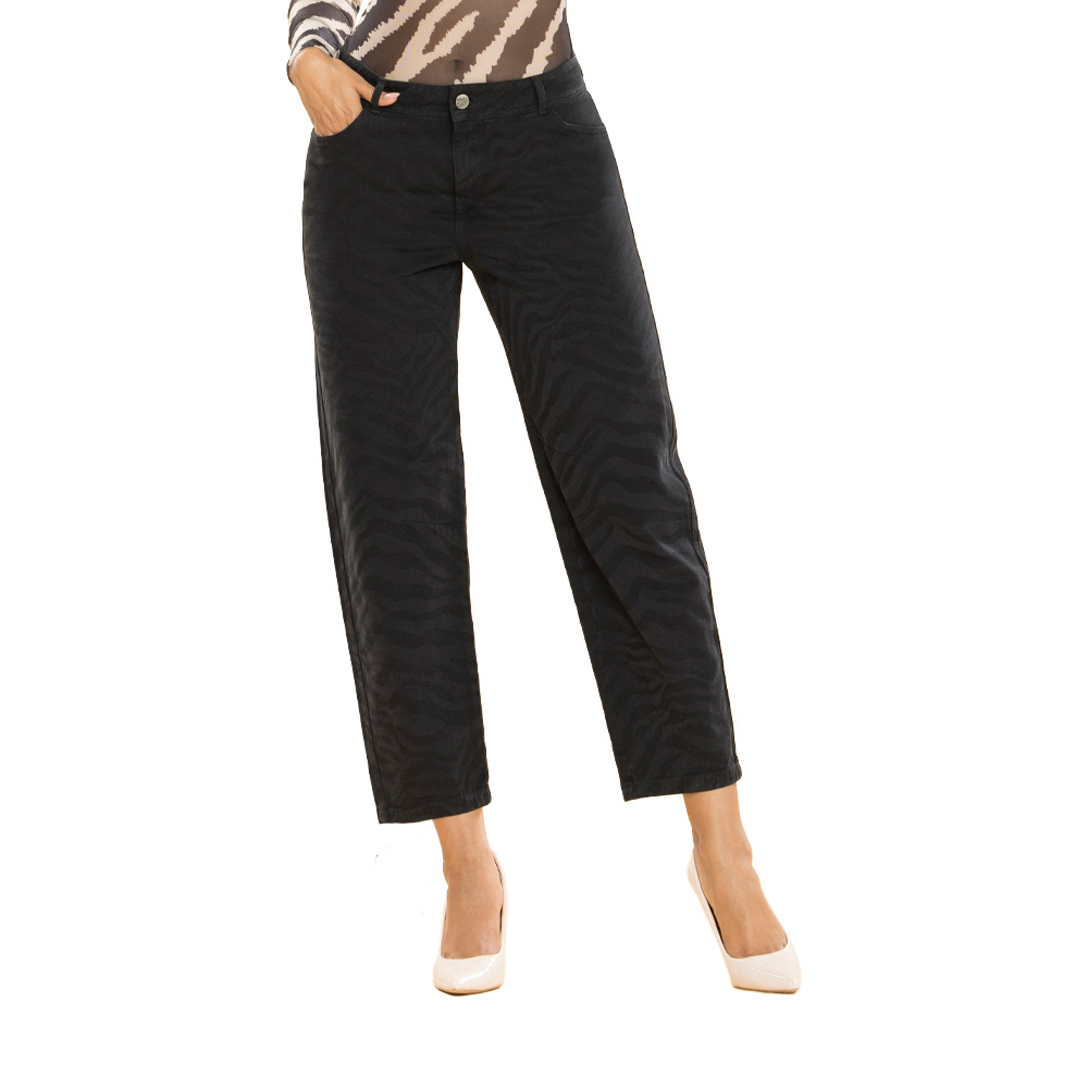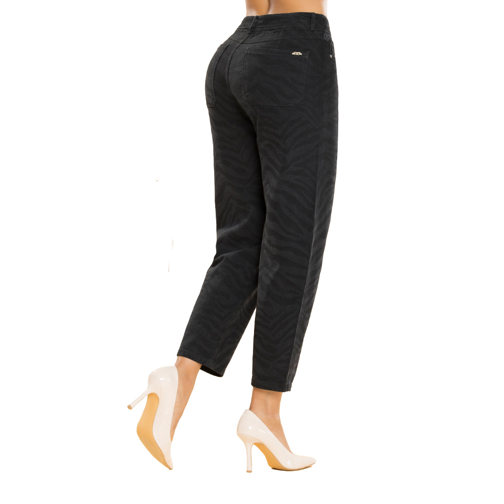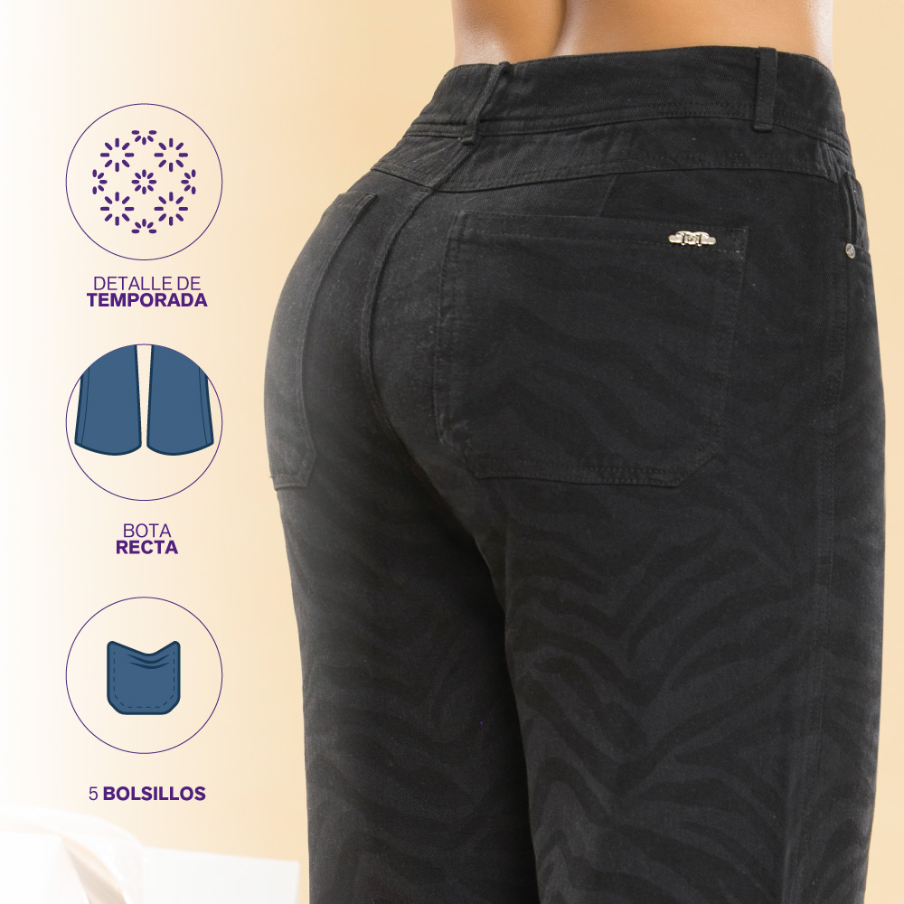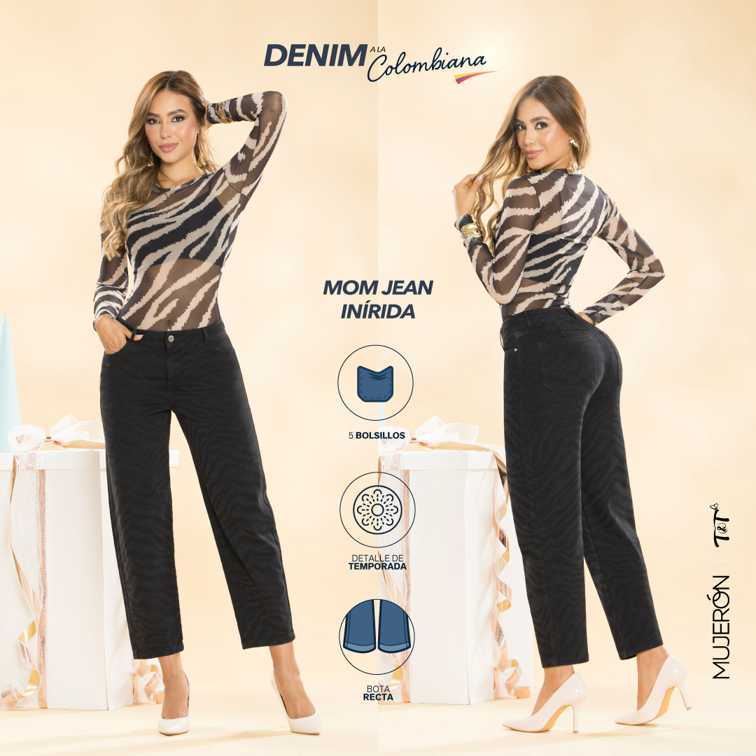 Domina tu look con el jean que redefine la elegancia. Corte Mom Jean con tiro alto que realza tu silueta. – Estampado Safari Print en negro: fuerza y estilo en una sola pieza. – Tela Índigo rígido que moldea sin perder estructura. Vive la seguridad y el poder del estilo Mujerón