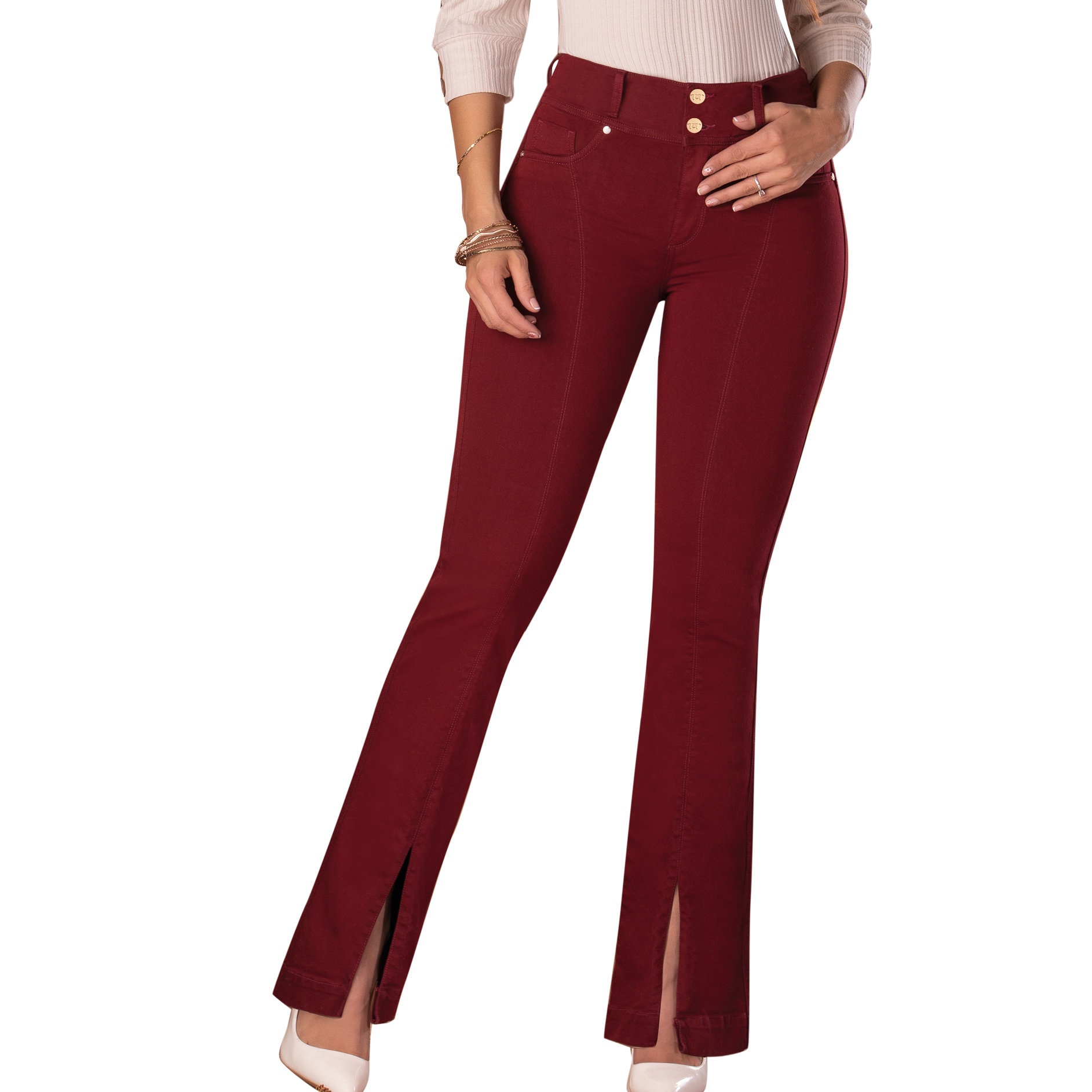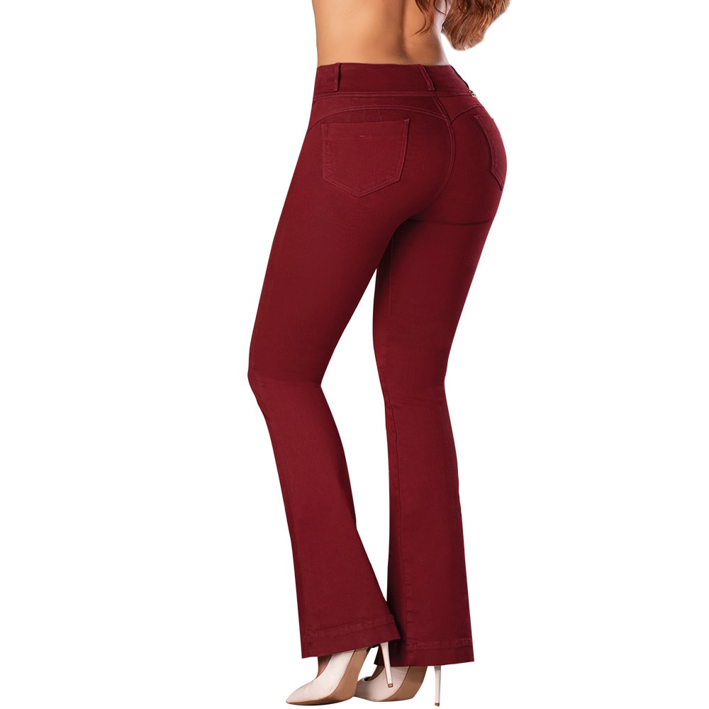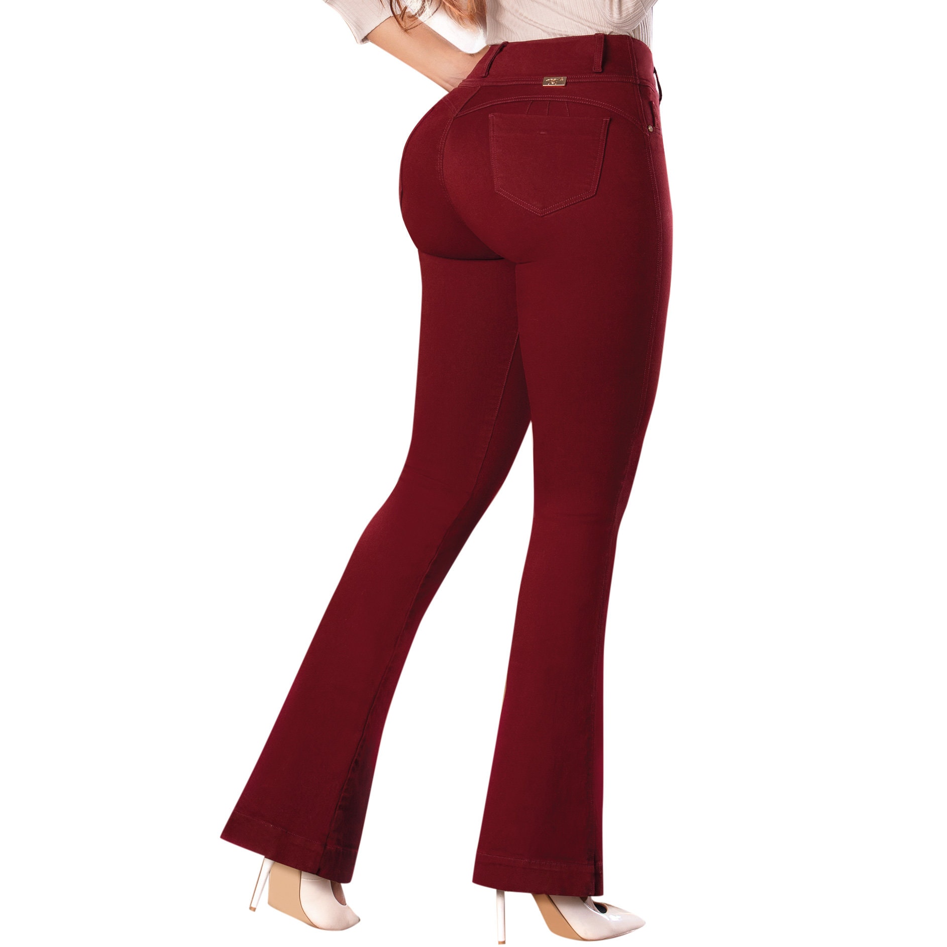Jeans colombianos levanta cola estilo Bot Cut con efecto Push Up y escultor, tiro alto, costura trasera en forma de corazón para mayor realce, 2 botones, bota semi campana con bolsillos traseros fuincionales.