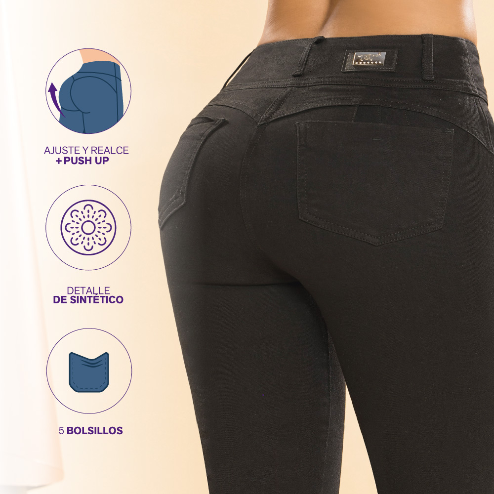 Define tu estilo con el jean que combina elegancia, comodidad y fuerza femenina. | – Fit jean de tiro alto que estiliza la silueta y resalta la cintura. – Color negro: sofisticado, versátil y atemporal. – Tela índigo licrado: ajuste perfecto con libertad de movimiento todo el día. Siente la confianza y presencia Mujerón.
